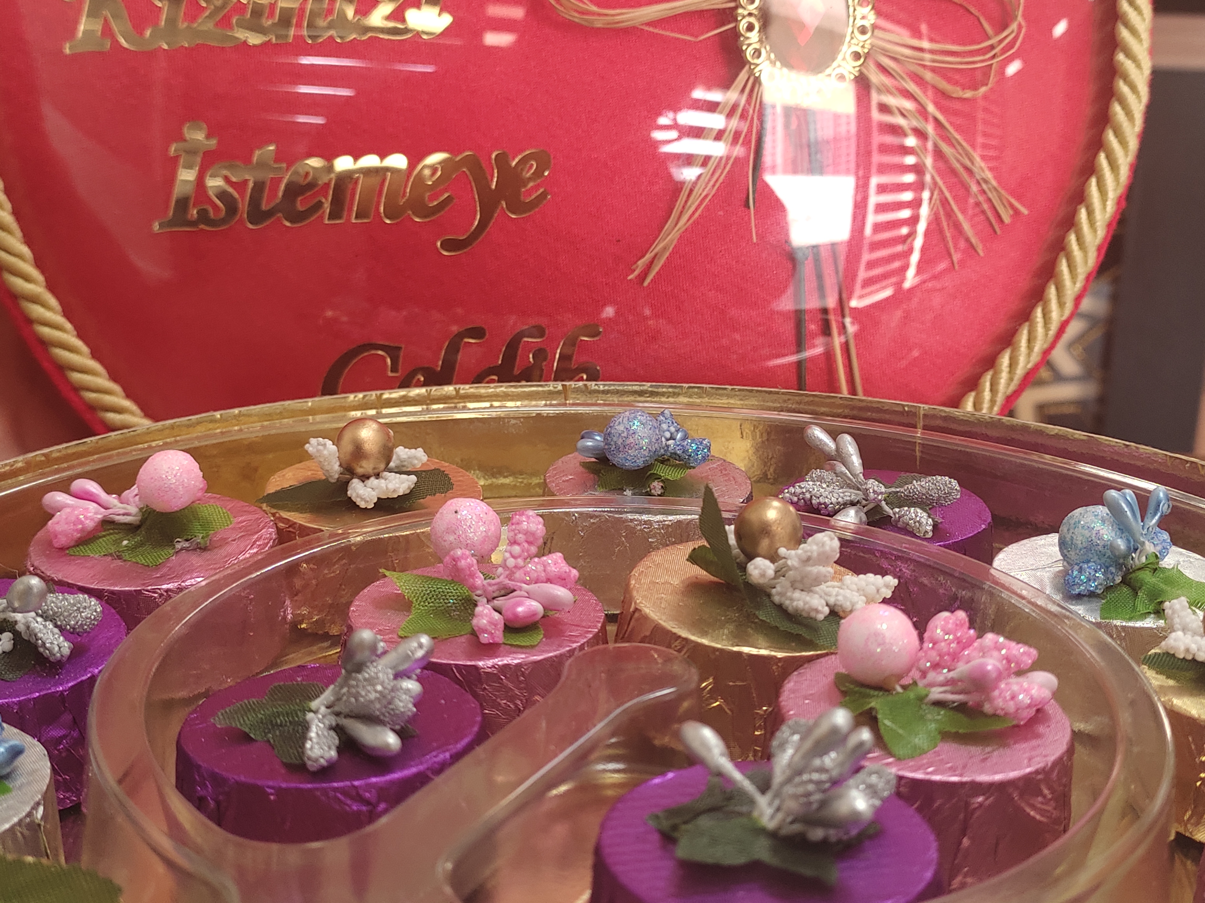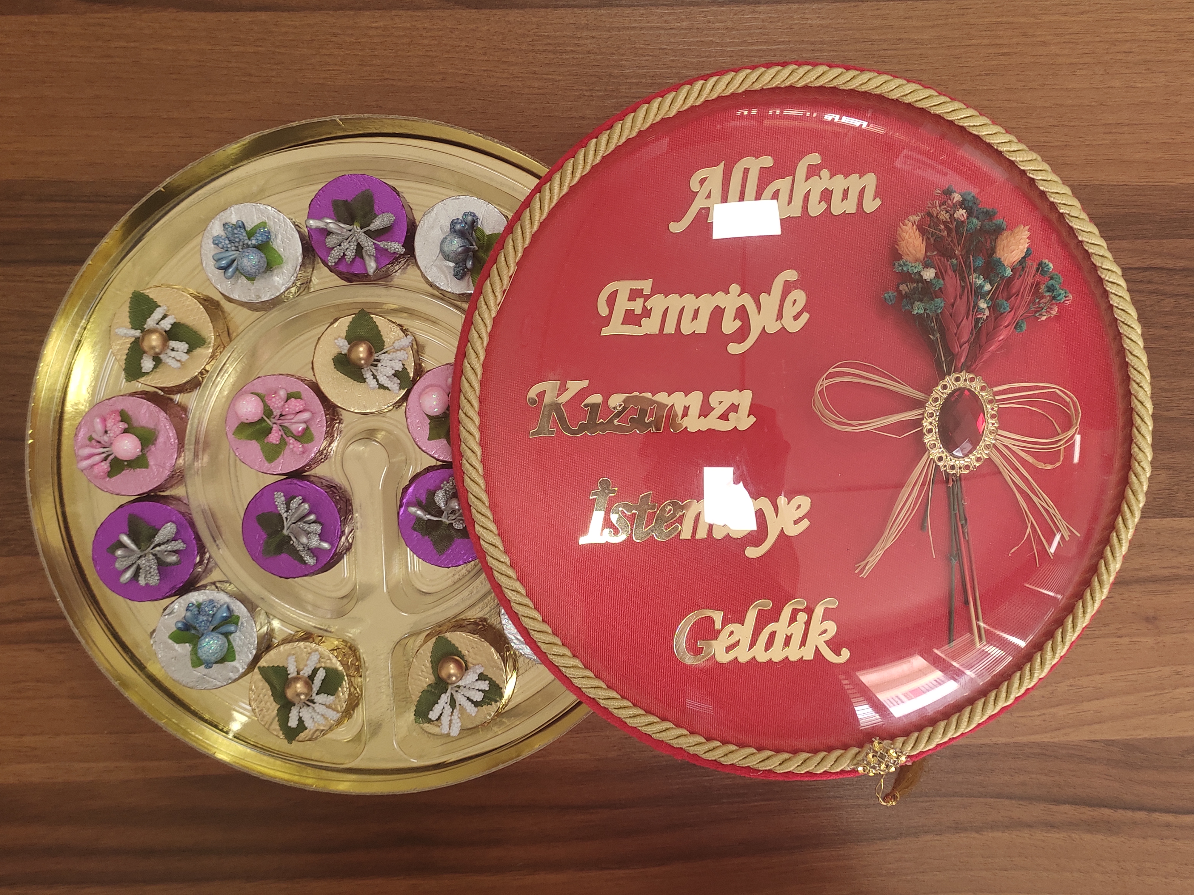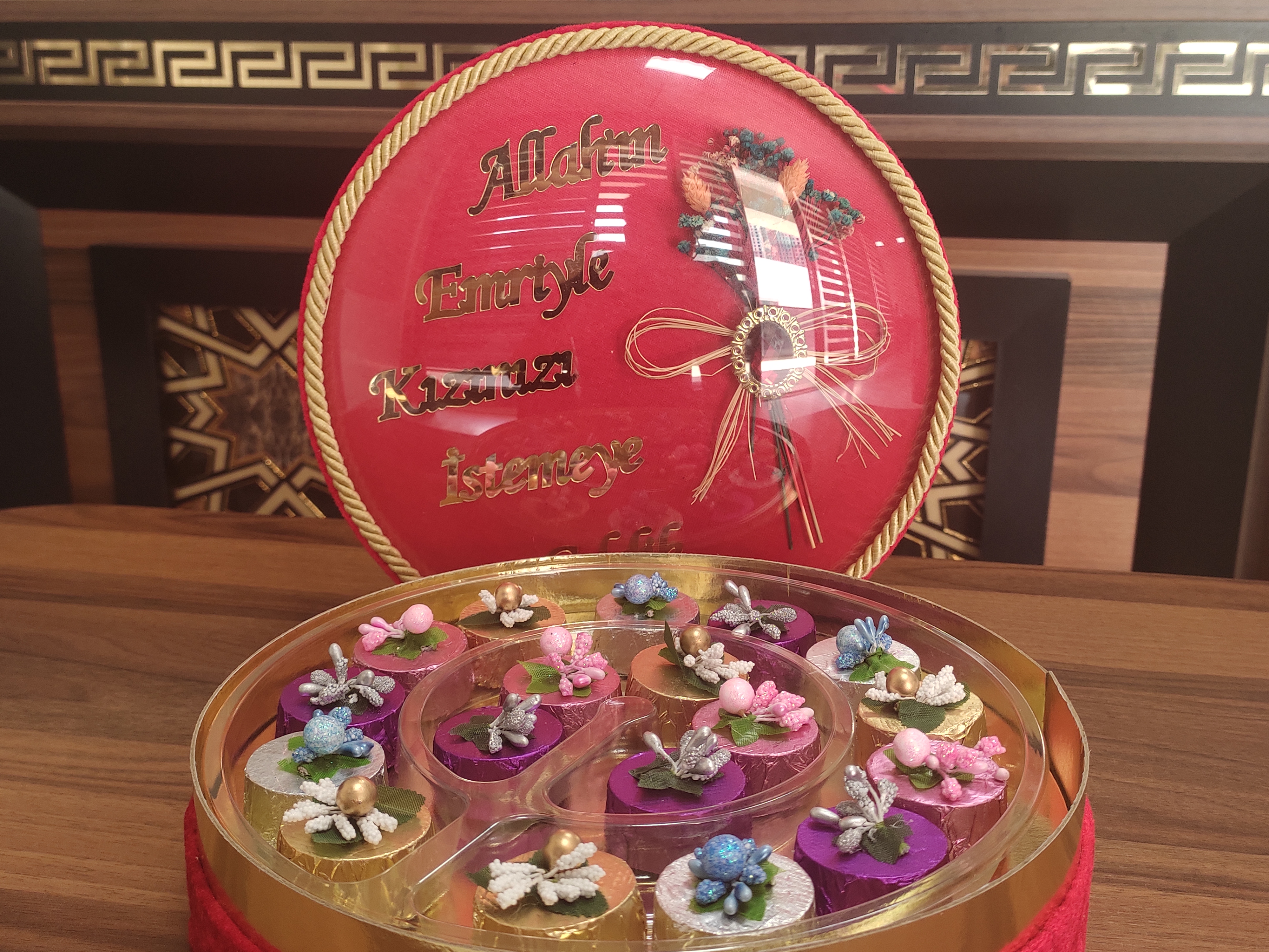 Kız isteme, söz, nişan, nişan tepsisi, evlilik çikolatası, söz çikolatası, nişan çikolatası, kız isteme çikolatası, dekorlu çikolata, çikolata üretim, çikolata fabrikası, yaldızlı çikolata, çiçekli çikolata