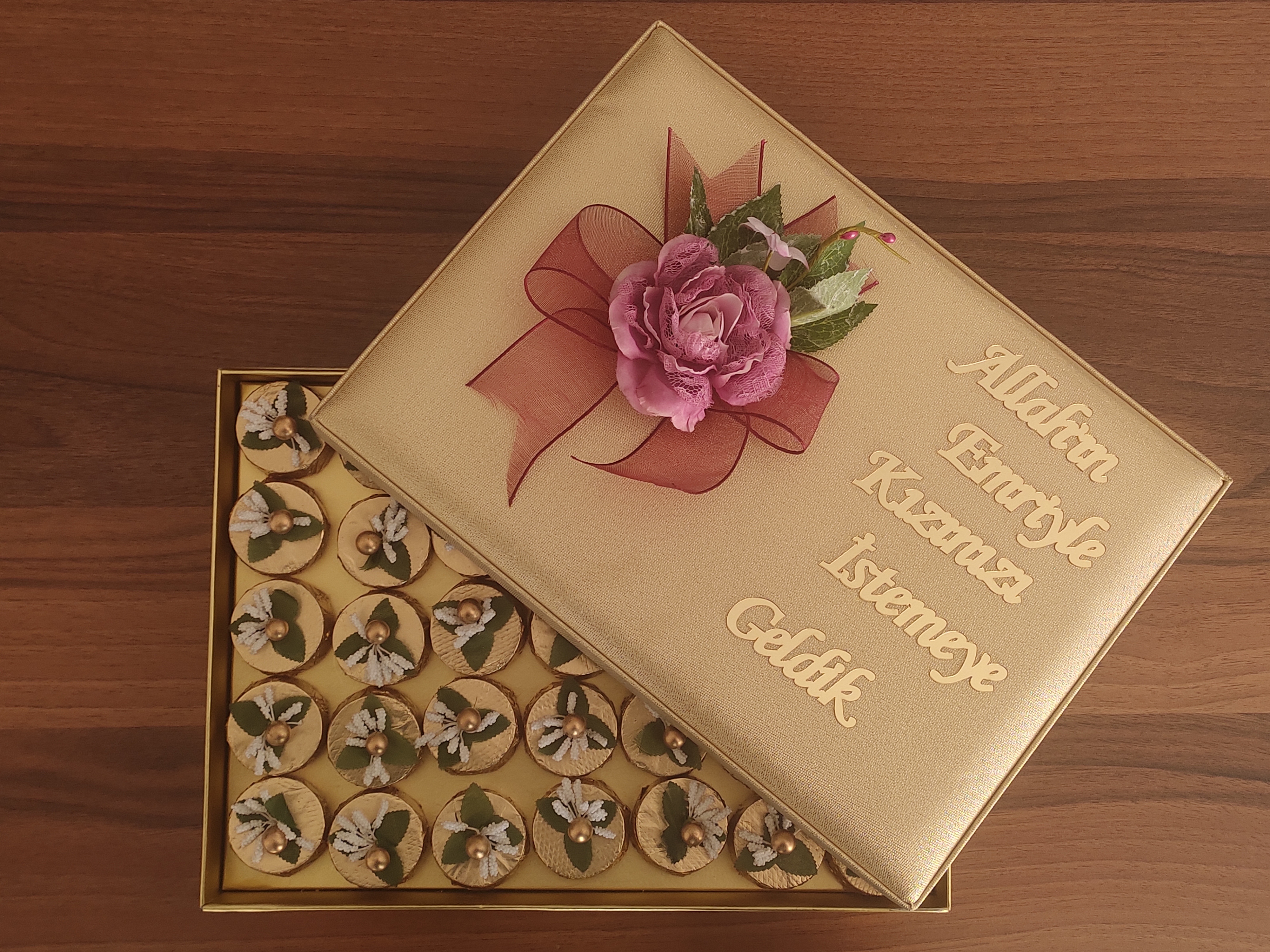 Kız isteme, söz, nişan, nişan tepsisi, evlilik çikolatası, söz çikolatası, nişan çikolatası, kız isteme çikolatası, dekorlu çikolata, çikolata üretim, çikolata fabrikası, yaldızlı çikolata, çiçekli çikolata